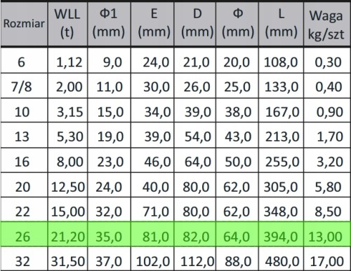 Rozmiar 26 nośność 21,2T