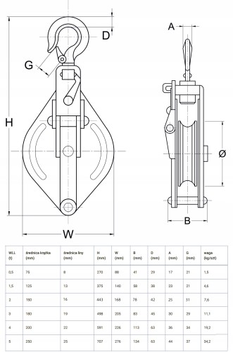 Składa się z pojedynczego kółka z wgłębieniem na linę oraz dwustronnej osłony i haka mocującego, zaopatrzonego w specjalną blokadę, dzięki której możliwe jest zdjęcie zblocza bez demontowania całego układu.